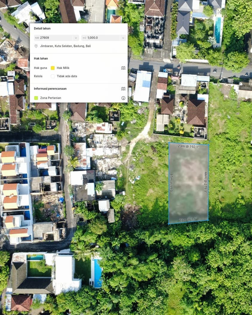 Lahan ada dalam zona hijau P-2 (Holti P-2) yang memungkinkan pembangunan sesuai ketentuan yang berlaku. Lahan ini sangat cocok untuk properti villa bernuansa alam, kebun produktif, atau land banking dengan potensi kenaikan nilai yang stabil di Jimbaran.